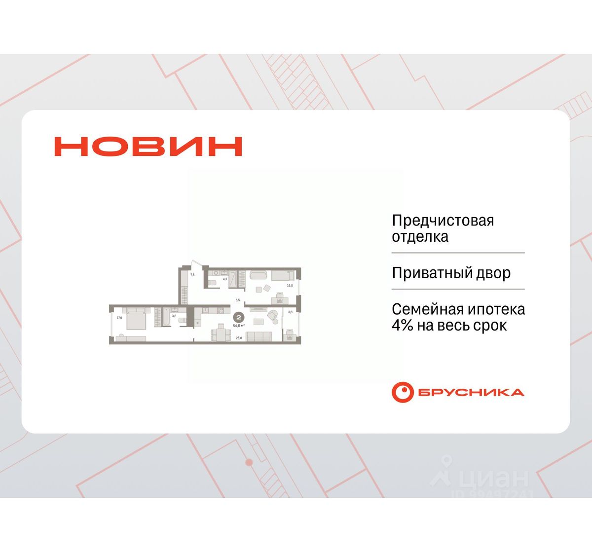 2-комн. квартира от застройщика с предчистовой отделкой в ЖК "Новин" на 8 этаже. Общая площадь: 84.64 кв.м., жилая: 33.9 кв.м., площадь просторной кухни-гостиной: 26 кв.м. Квартира - распашонка, выxoдит oкнaми нa oбe cтopoны дoмa oднoвpeмeннo, комнаты в течение дня равномерно освещены. В квартире одна лоджия, два совмещенных санузла. Высота потолков 2.7 м.