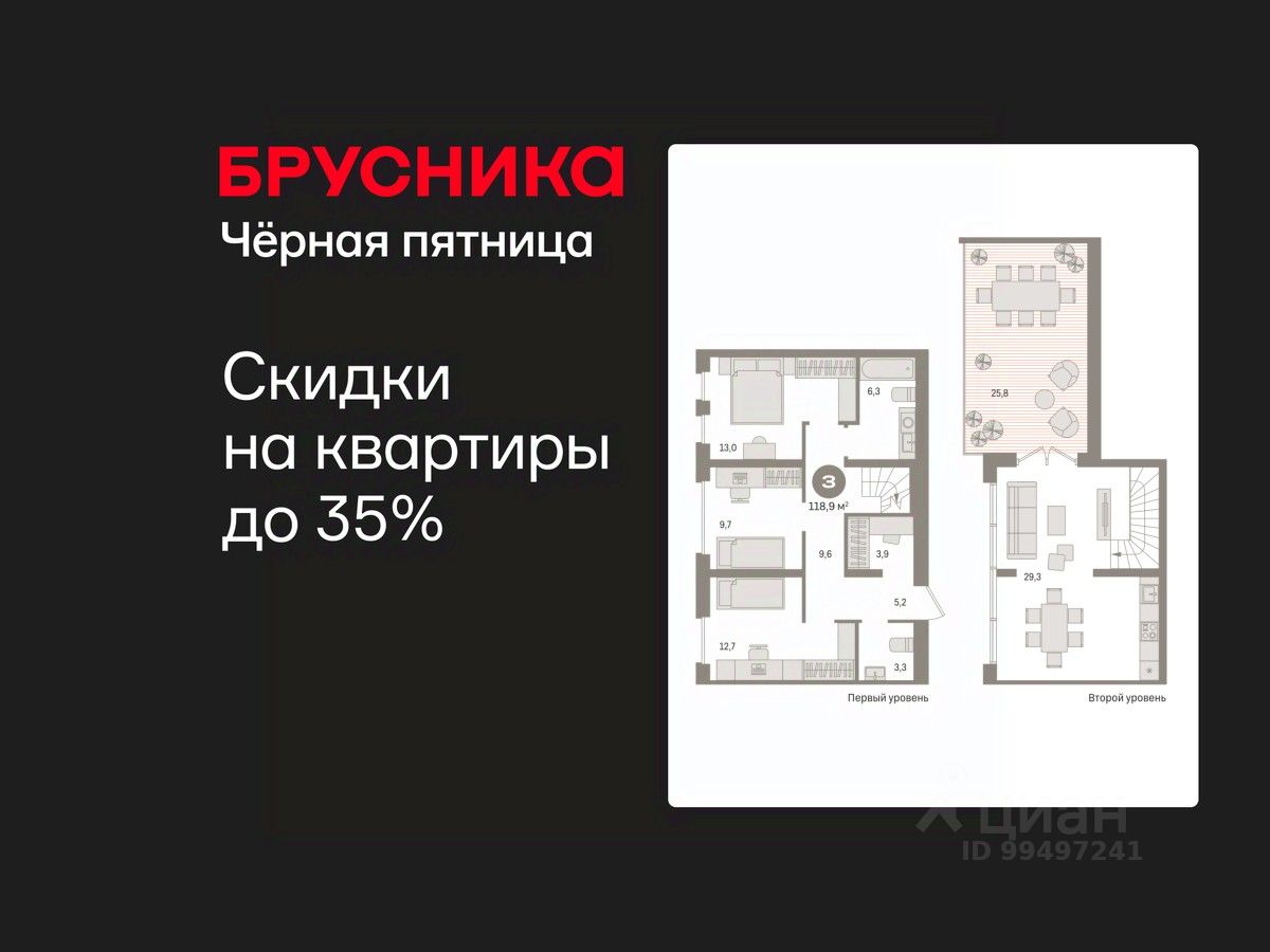 Двухуровневая квартира с кухней-гостиной и тремя спальнями в квартале "Новин". Особенности планировки: второй санузел, гардеробная, двухуровневая, вид во двор, панорамное остекление, предчистовая отделка, мастер-спальня, терраса на крыше.