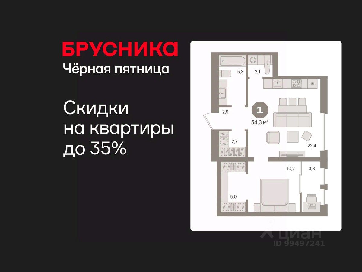 Однокомнатная квартира с предчистовой отделкой в ЖК "Новин" на 7 этаже. Общая площадь: 54.34 кв.м., жилая: 10.2 кв.м., площадь просторной кухни-гостиной: 22.4 кв.м. Все окна выходят на одну сторону. В квартире одна лоджия, один совмещенный санузел. Высота потолков 2.7 м.