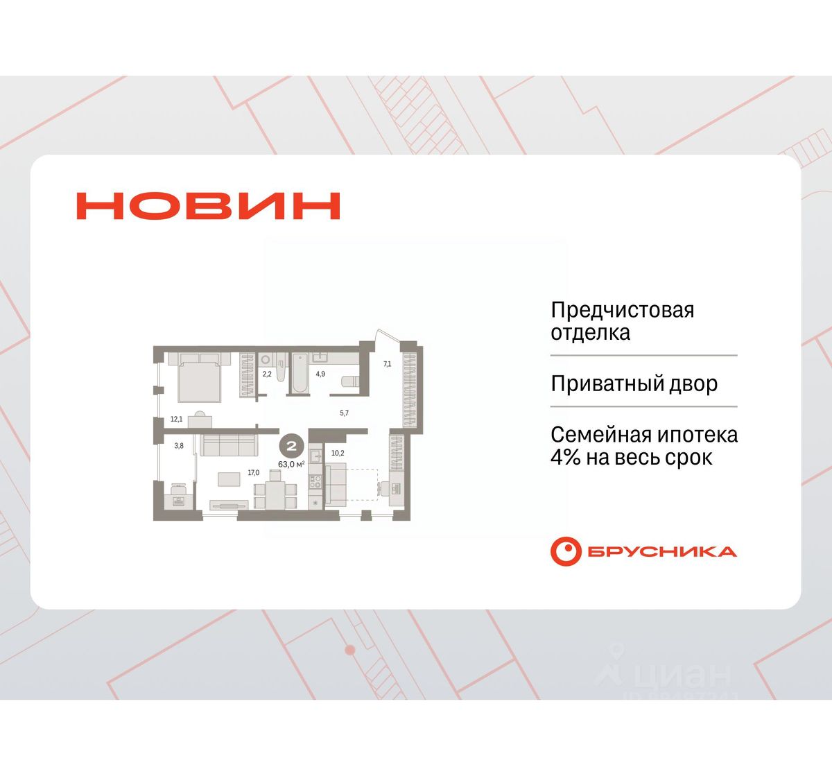 Двухкомнатная квартира с предчистовой отделкой в ЖК "Новин" на 11 этаже. Общая площадь: 62.95 кв.м., жилая: 22.3 кв.м., площадь просторной кухни-гостиной: 17 кв.м. Комнаты изолированные, все окна выходят на одну сторону. В квартире одна лоджия, один совмещенный санузел. Высота потолков 2.7 м.
