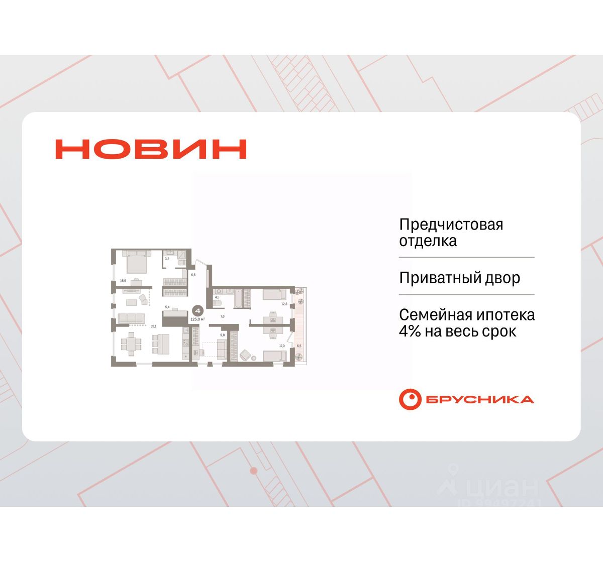 Квартира с кухней-гостиной и четырьмя спальнями в квартале "Новин". Особенности планировки: гардеробная, рабочий кабинет, вид во двор, разнесённые спальни, предчистовая отделка, мастер-спальня, терраса на крыше.