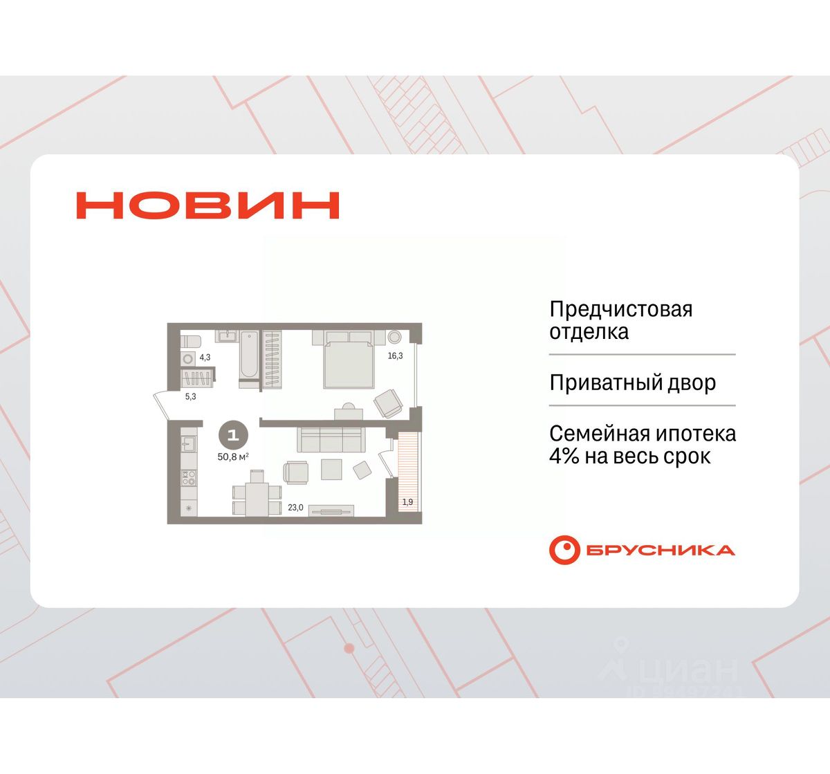 1-комн. квартира от застройщика с предчистовой отделкой в ЖК "Новин" на 13 этаже. Общая площадь: 50.84 кв.м., жилая: 16.3 кв.м., площадь просторной кухни-гостиной: 23 кв.м. Все окна выходят на одну сторону. В квартире одна лоджия, один совмещенный санузел. Высота потолков 2.7 м.