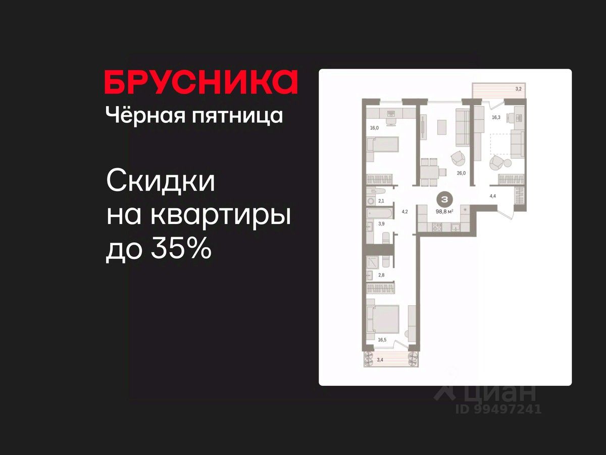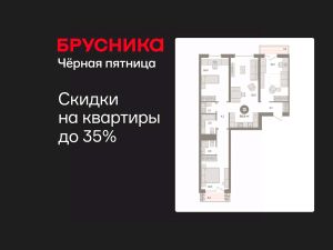 Квартира с кухней-гостиной и тремя спальнями в квартале "Новин". Особенности планировки: окна на две стороны, вид во двор, разнесённые спальни, предчистовая отделка, мастер-спальня, постирочная, балкон.