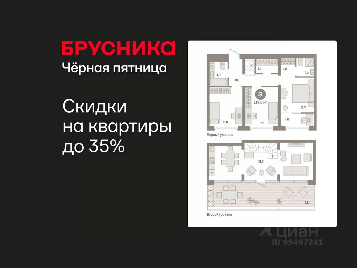 Двухуровневая квартира с кухней-гостиной и тремя спальнями в квартале "Новин". Особенности планировки: гардеробная, двухуровневая, вид во двор, панорамное остекление, тёплая лоджия, предчистовая отделка, мастер-спальня, терраса на крыше.