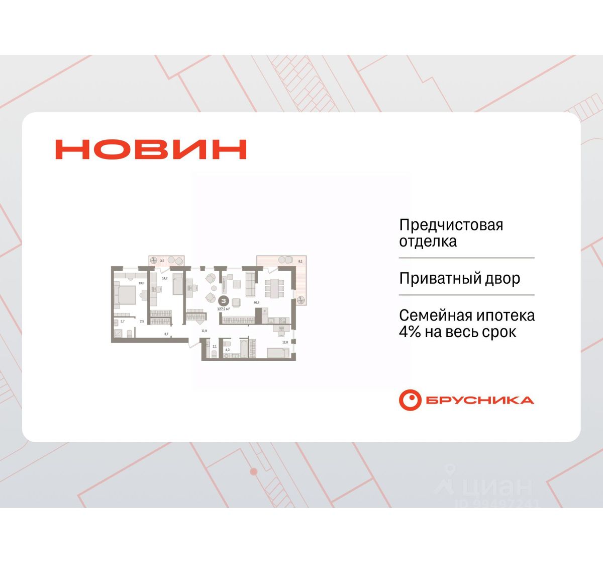Квартира с кухней-гостиной и тремя спальнями в квартале "Новин". Особенности планировки: второй санузел, гардеробная, рабочий кабинет, разнесённые спальни, предчистовая отделка, мастер-спальня, балкон.