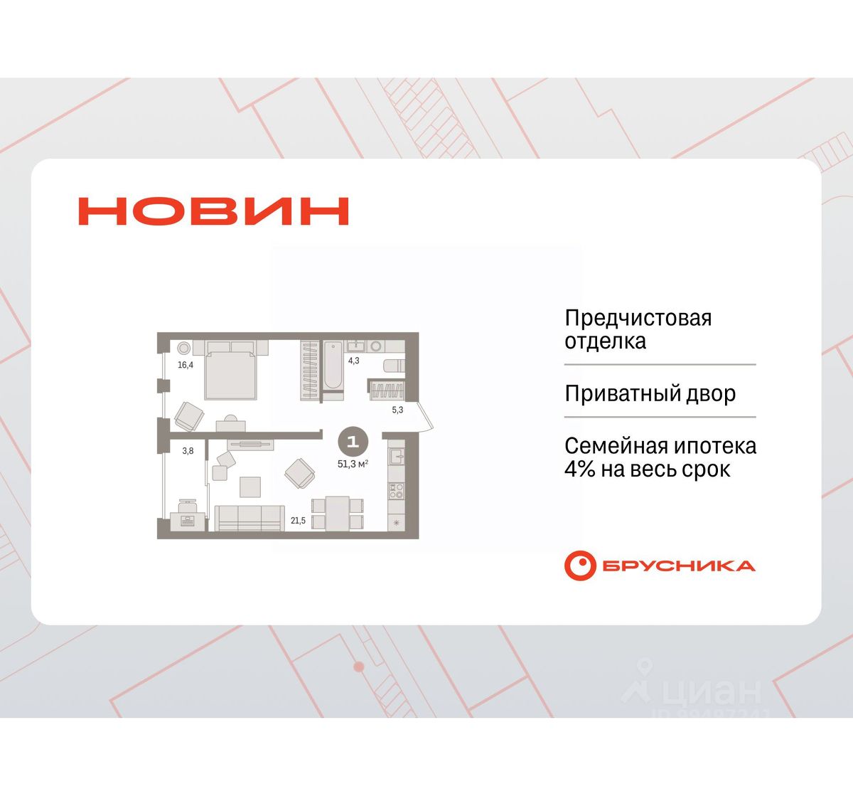 Однокомнатная квартира с предчистовой отделкой в ЖК "Новин" на 12 этаже. Общая площадь: 51.29 кв.м., жилая: 16.4 кв.м., площадь просторной кухни-гостиной: 21.5 кв.м. Все окна выходят на одну сторону. В квартире одна лоджия, один совмещенный санузел. Высота потолков 2.7 м.