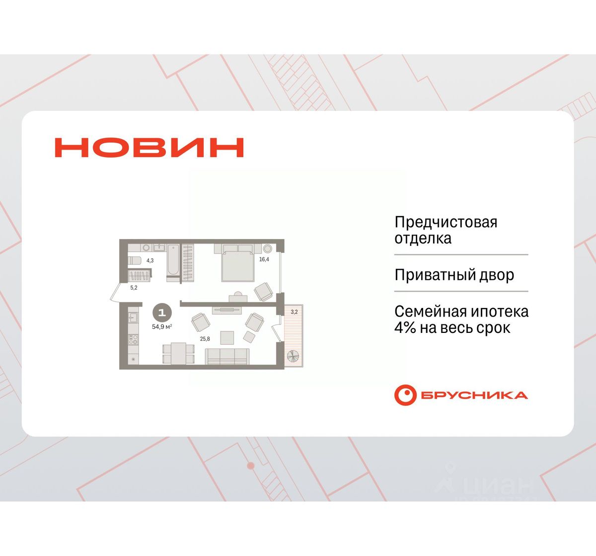 Однокомнатная квартира с предчистовой отделкой в ЖК "Новин" на 5 этаже. Общая площадь: 54.9 кв.м., жилая: 16.4 кв.м., площадь просторной кухни-гостиной: 25.8 кв.м. Все окна выходят на одну сторону. В квартире один балкон, один совмещенный санузел. Высота потолков 2.7 м.