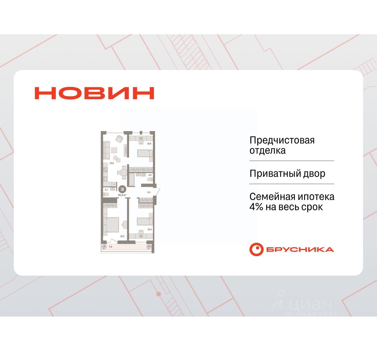 Квартира с кухней-гостиной и тремя спальнями в квартале "Новин". Особенности планировки: вид во двор, второй санузел, окна на две стороны, предчистовая отделка, разнесённые спальни, терраса на крыше.