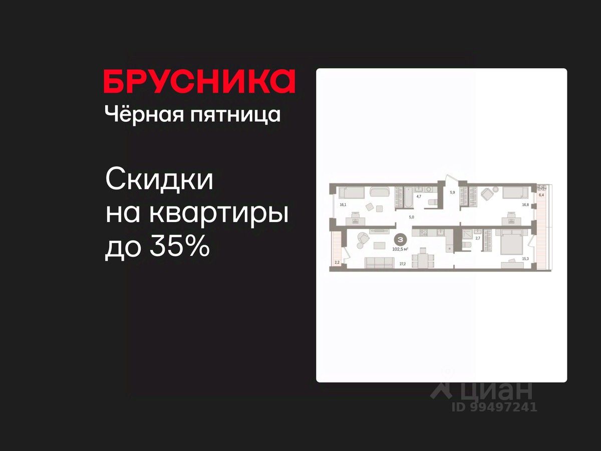 Квартира с кухней-гостиной и тремя спальнями в квартале "Новин". Особенности планировки: окна на две стороны, гардеробная, вид во двор, лоджия, разнесённые спальни, предчистовая отделка, мастер-спальня, терраса на крыше.