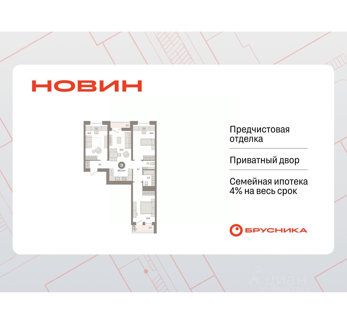 3-комн. квартира от застройщика с предчистовой отделкой в ЖК "Новин" на 8 этаже. Общая площадь: 90.42 кв.м., жилая: 47.9 кв.м., площадь просторной кухни-гостиной: 23.4 кв.м. Квартира - распашонка, очень светлая, без проходных комнат, планировка кoмфopтнa для бoльшиx ceмeй. В квартире один балкон и одна лоджия, один совмещенный и один раздельный санузел. Высота потолков 2.7 м.