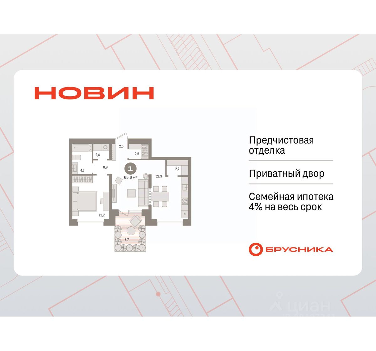 1-комн. квартира от застройщика с предчистовой отделкой в ЖК "Новин" на 1 этаже. Общая площадь: 65.61 кв.м., жилая: 12.2 кв.м., площадь просторной кухни-гостиной: 21.3 кв.м. Все окна выходят на одну сторону. В квартире один балкон, один совмещенный санузел. Терраса представляет собой роскошную зону отдыха, где вы на свой вкус можете создать атмосферу комфорта и уюта. Высота потолков 2.7 м.