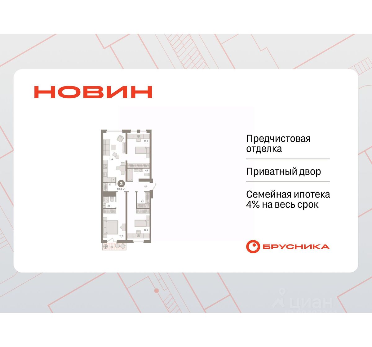 Продается 3-комн. квартира от застройщика с предчистовой отделкой в ЖК "Новин" на 7 этаже. Общая площадь: 95.96 кв.м. Высота потолков 2.7 м.