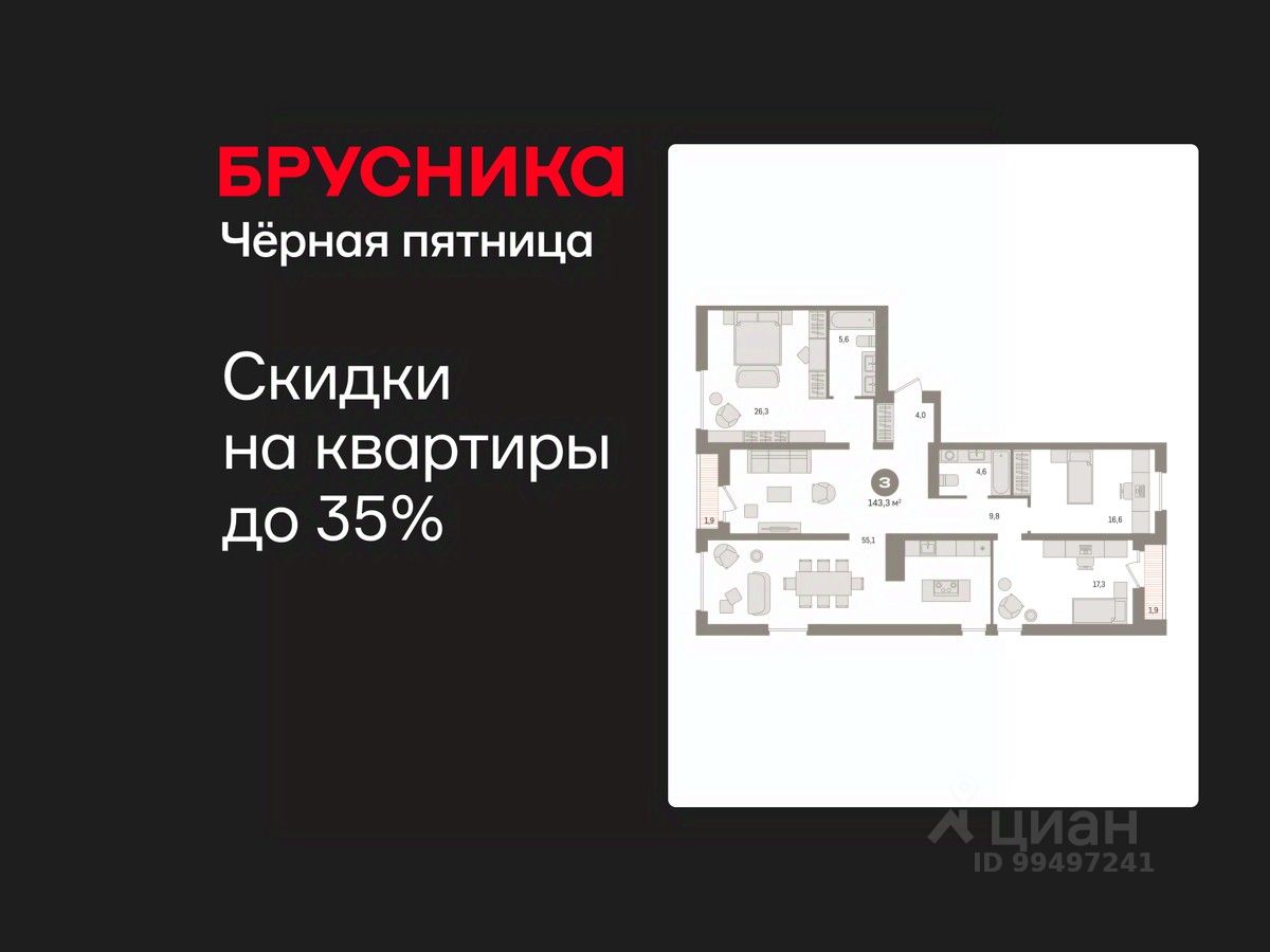 Трехкомнатная квартира с предчистовой отделкой в ЖК "Новин" на 17 этаже. Общая площадь: 143.25 кв.м. Высота потолков 2.7 м.