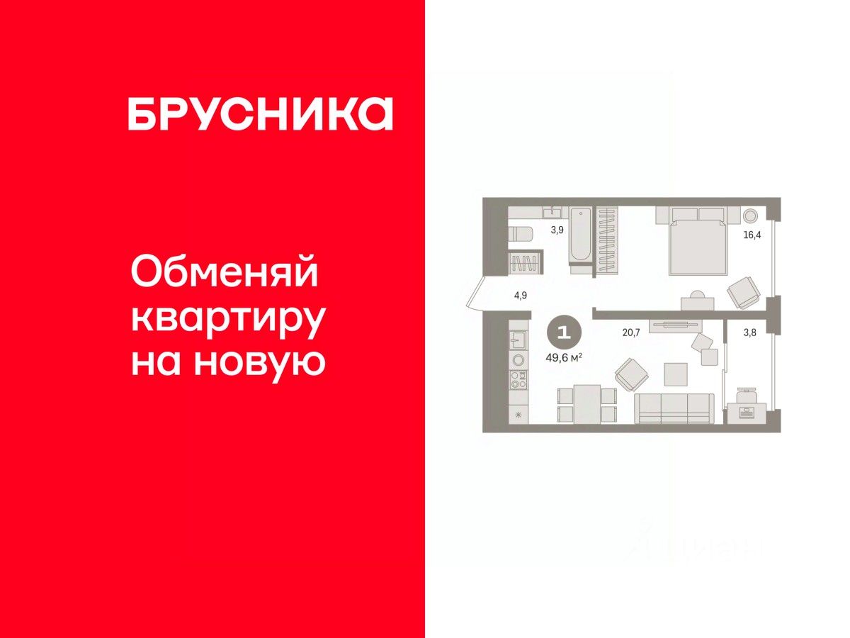 Квартира с кухней-гостиной и одной спальней в квартале "Новин". Особенности планировки: предчистовая отделка, тёплая лоджия.