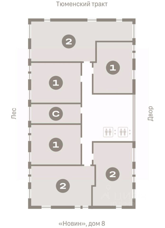 Квартира с кухней-гостиной и двумя спальнями в квартале "Новин". Особенности планировки: балкон, вид во двор, мастер-спальня, предчистовая отделка.