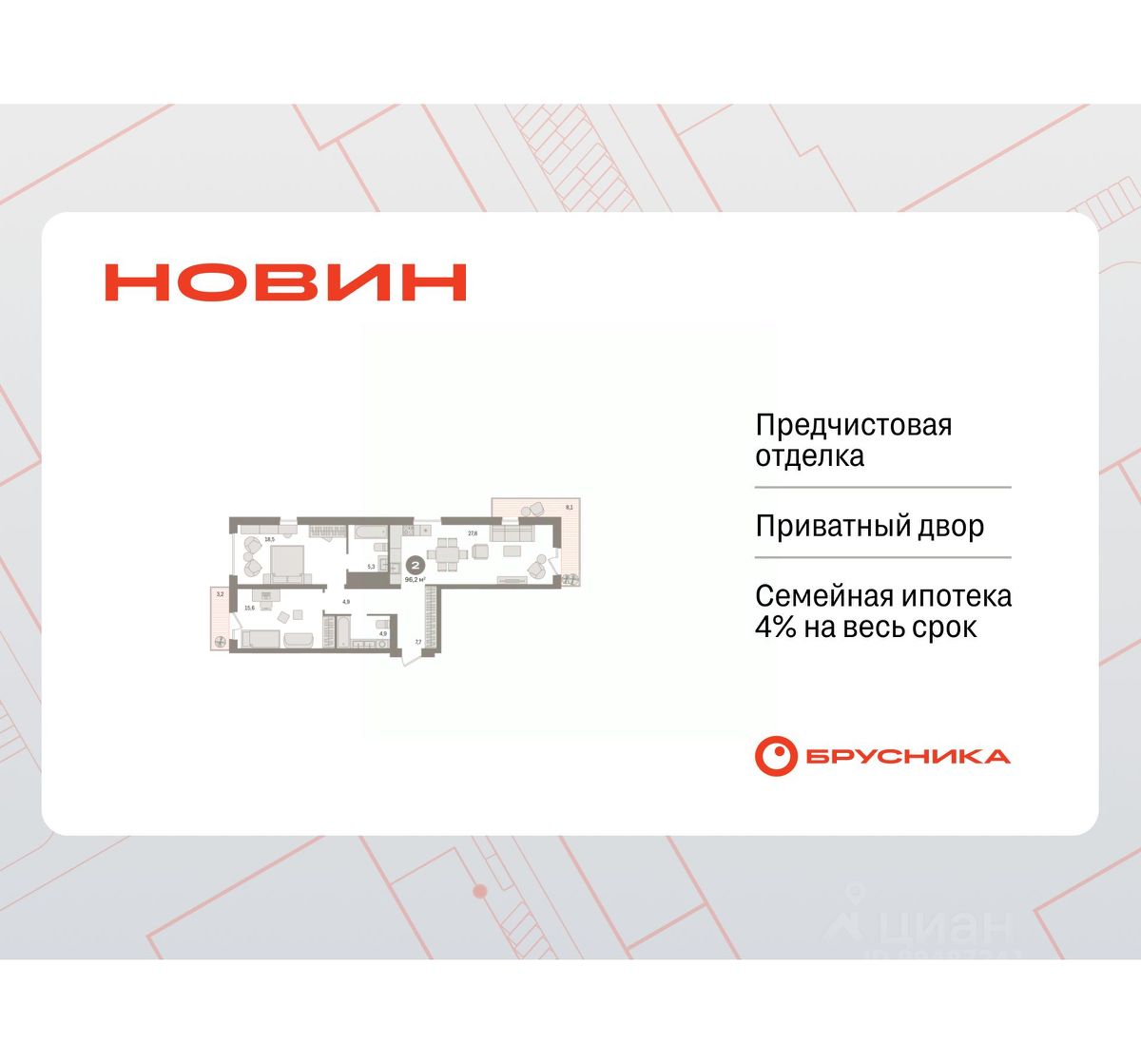 Продается двухкомнатная квартира от застройщика с предчистовой отделкой в ЖК "Новин" на 13 этаже. Общая площадь: 96.17 кв.м. Высота потолков 2.7 м.