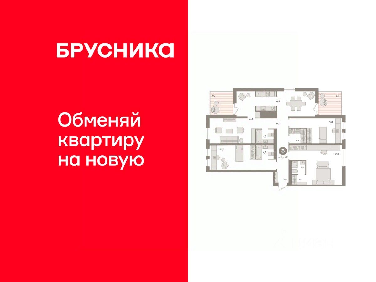 3-комн. квартира с предчистовой отделкой в ЖК "Новин" на 15 этаже. Общая площадь: 172.9 кв.м. Высота потолков 2.7 м.