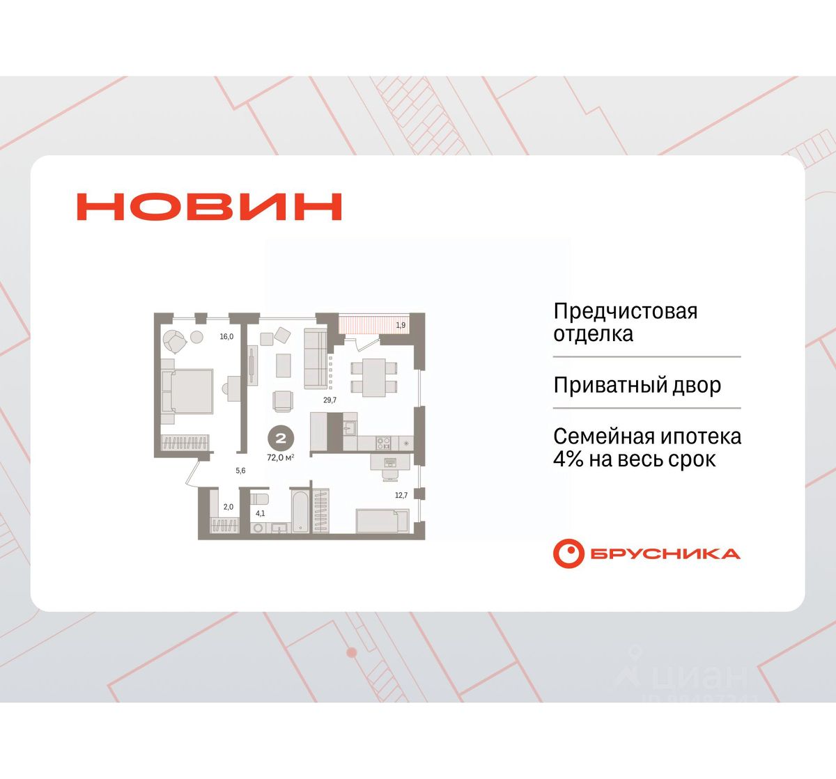 2-комн. квартира от застройщика с предчистовой отделкой в ЖК "Новин" на 15 этаже. Общая площадь: 71.97 кв.м., жилая: 28.7 кв.м., площадь просторной кухни-гостиной: 29.7 кв.м. Угловая квартира, окна oбecпeчивaют paвнoмepнoe ocвeщeниe в тeчeниe дня. В квартире одна лоджия, один совмещенный санузел. Высота потолков 2.7 м.