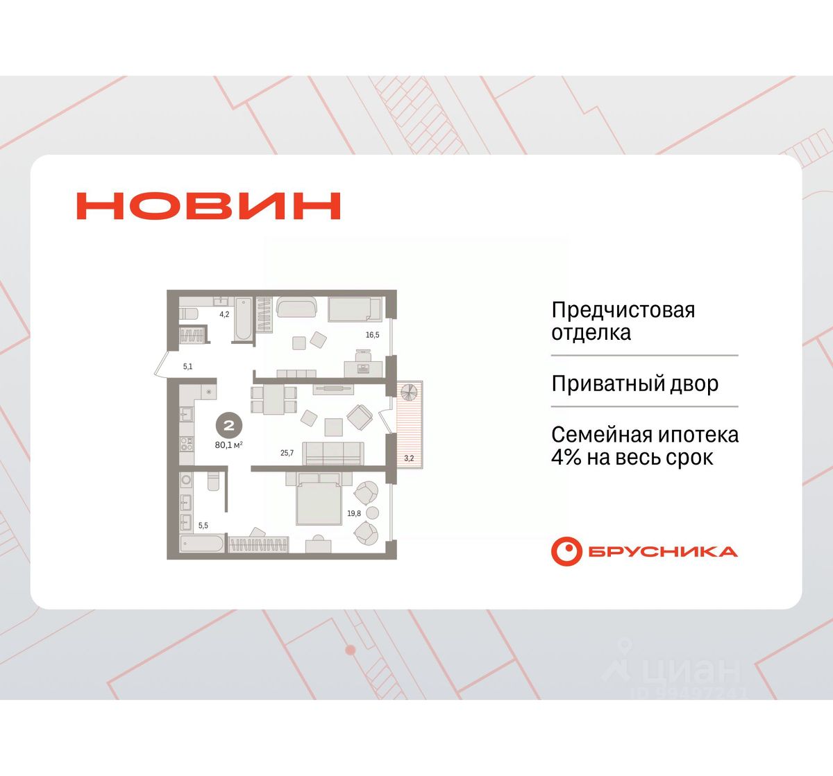 2-комн. квартира от застройщика с предчистовой отделкой в ЖК "Новин" на 6 этаже. Общая площадь: 80.06 кв.м., жилая: 36.3 кв.м., площадь просторной кухни-гостиной: 25.7 кв.м. Комнаты изолированные, все окна выходят на одну сторону. В квартире один балкон, два совмещенных санузла. Высота потолков 2.7 м.
