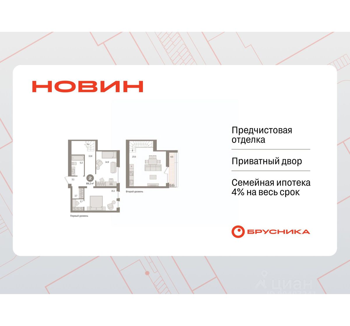 2-комн. квартира от застройщика с предчистовой отделкой в ЖК "Новин" на 8 этаже. Общая площадь: 89.2 кв.м., жилая: 30 кв.м., площадь просторной кухни-гостиной: 27 кв.м. Комнаты изолированные, все окна выходят на одну сторону. В квартире один балкон, один совмещенный санузел. Высота потолков 2.7 м.