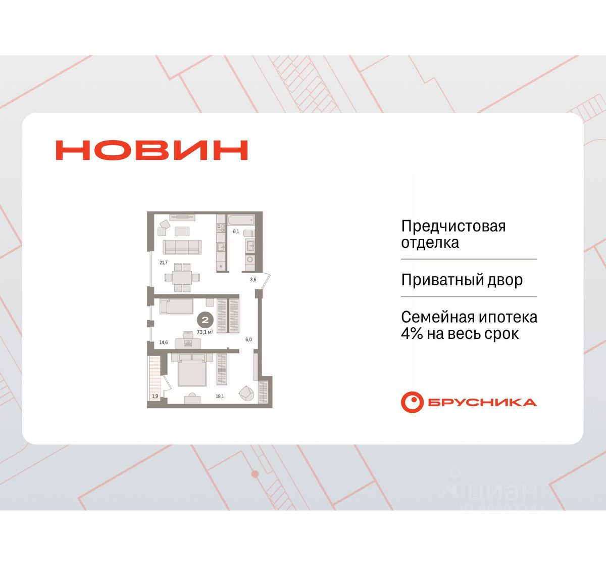 Просторная двухкомнатная квартира с предчистовой отделкой в ЖК "Новин" на 9 этаже. Общая площадь: 73.08 кв.м., жилая: 33.7 кв.м., площадь просторной кухни-гостиной: 21.7 кв.м. Комнаты изолированные, все окна выходят на одну сторону. В квартире одна лоджия, один совмещенный санузел. Высота потолков 2.7 м.