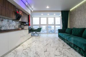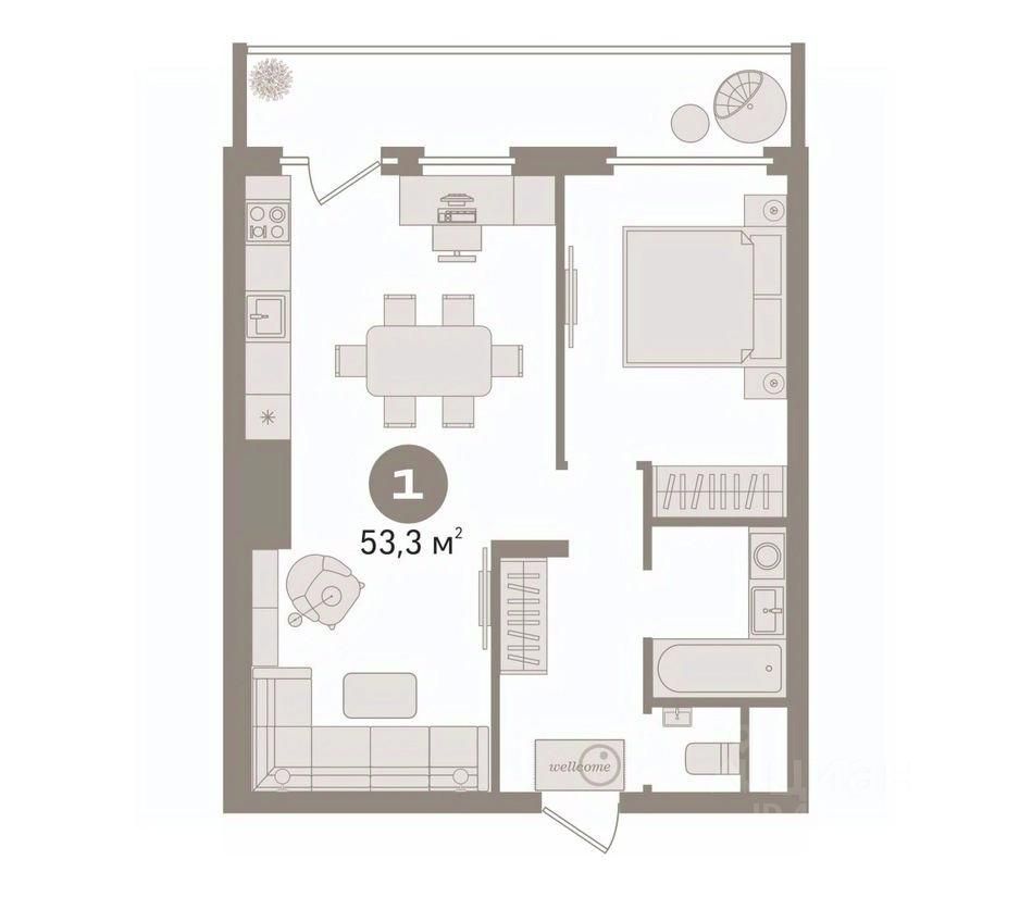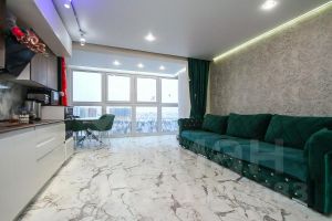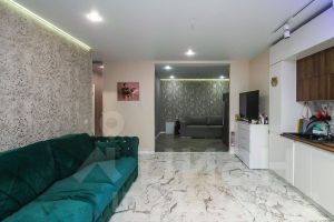 Однокомнатная квартира общей площадью 60,8 кв.м., без учета балкона. Планировка евродвушка, кухня-гостиная и спальня. Раздельный сан. узел.