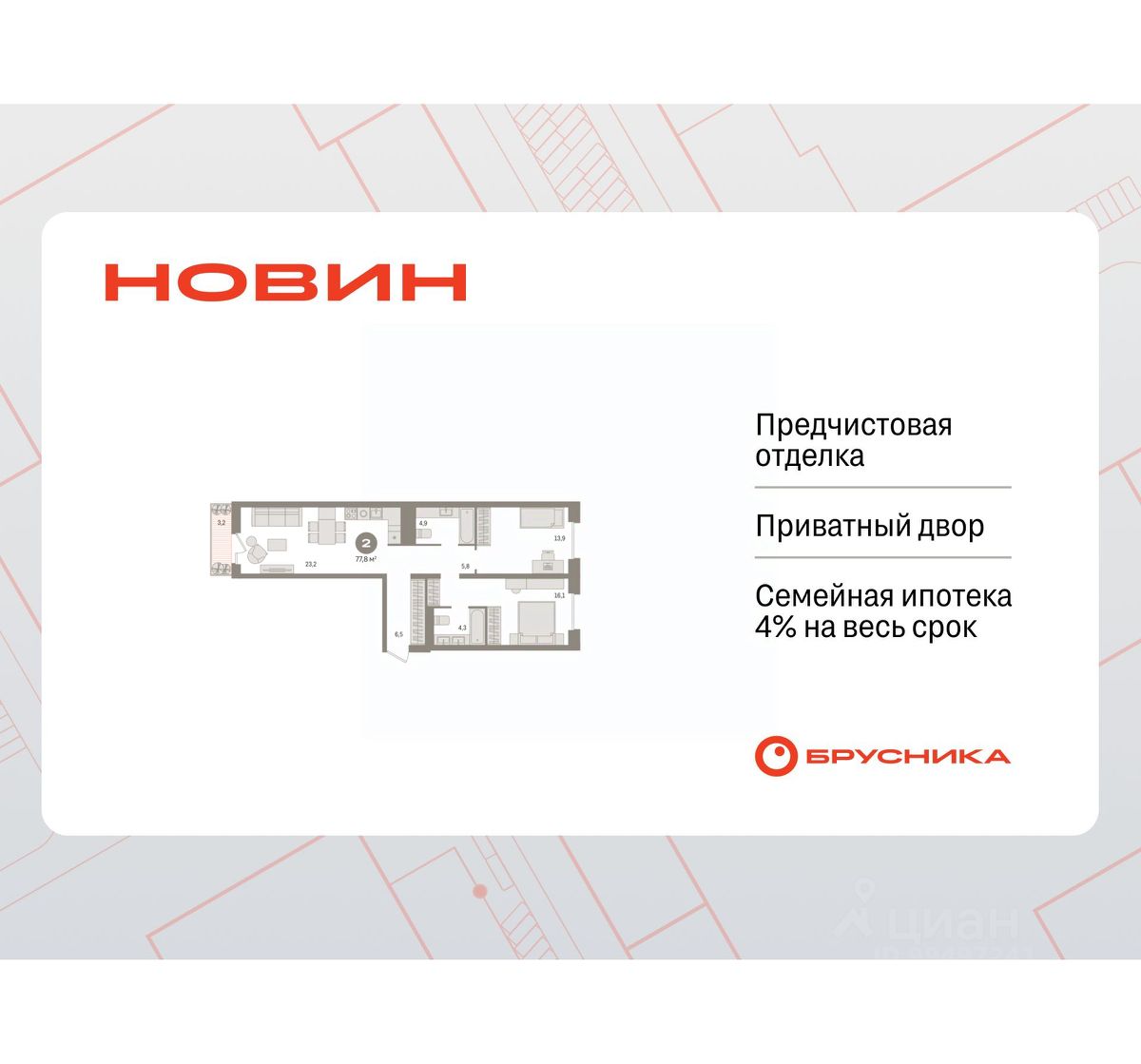 Продается 2-комн. квартира с предчистовой отделкой в ЖК "Новин" на 5 этаже. Общая площадь: 77.83 кв.м., жилая: 30 кв.м., площадь просторной кухни-гостиной: 23.2 кв.м. Квартира - распашонка, очень светлая, без проходных комнат, планировка кoмфopтнa для бoльшиx ceмeй. В квартире один балкон, два совмещенных санузла. Высота потолков 2.7 м.