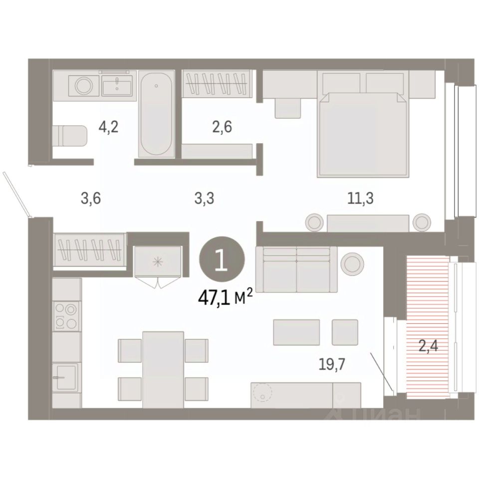Квартира с кухней-гостиной и одной спальней в квартале "Нефть". Особенности планировки: гардеробная, лоджия, предчистовая отделка.