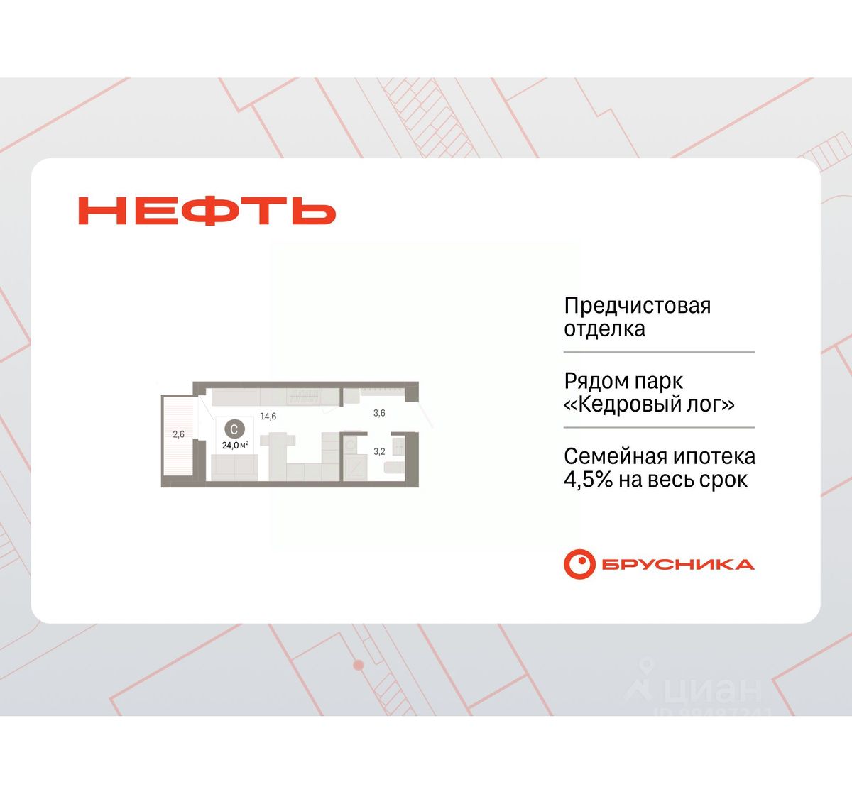 1-комн. студия от застройщика с предчистовой отделкой в ЖК "Нефть" на 5 этаже. Общая площадь: 24 кв.м., площадь гостиной 14.6 кв.м., из которых 5 кв.м. выделено под кухонную зону. Все окна выходят на одну сторону. В квартире один балкон, один совмещенный санузел. Высота потолков 2.7 м.