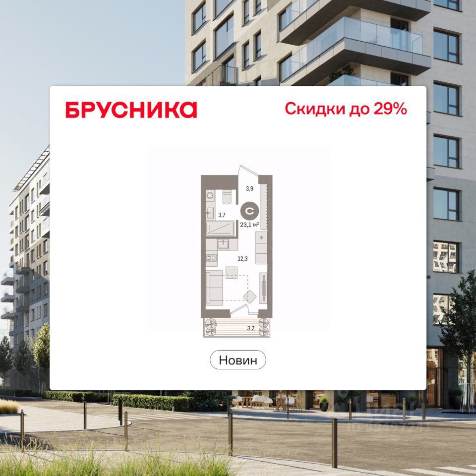 Студия в квартале "Новин". Особенности планировки: балкон, вид во двор, предчистовая отделка.