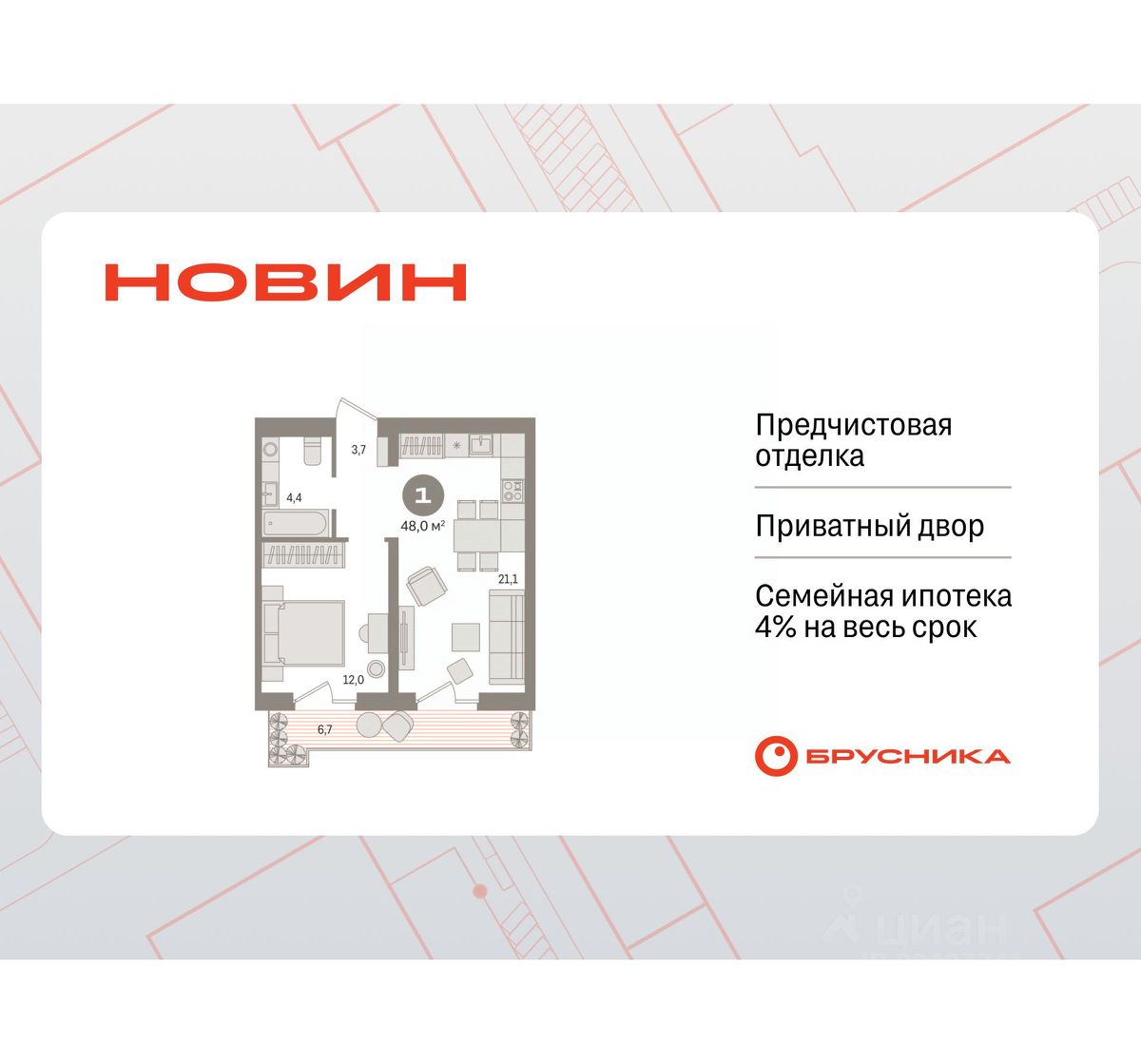 Квартира с кухней-гостиной и одной спальней в квартале "Новин". Особенности планировки: балкон, вид во двор, предчистовая отделка.