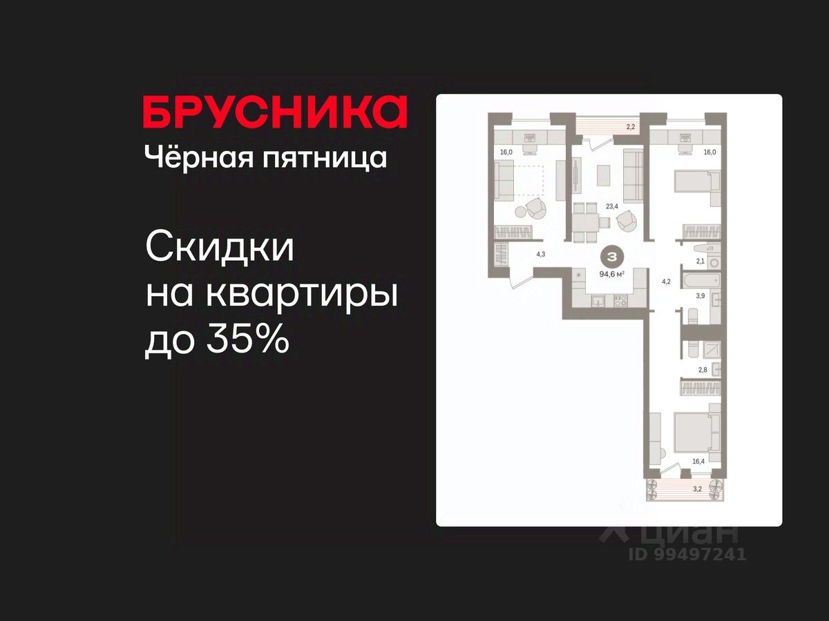 Квартира с кухней-гостиной и тремя спальнями в квартале "Новин". Особенности планировки: окна на две стороны, вид во двор, лоджия, разнесённые спальни, предчистовая отделка, мастер-спальня, постирочная, балкон.
