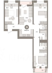 Квартира с кухней-гостиной и тремя спальнями в квартале "Новин". Особенности планировки: балкон, вид во двор, ипотека 0,11%, лоджия, мастер-спальня, окна на две стороны, постирочная, предчистовая отделка, разнесённые спальни.