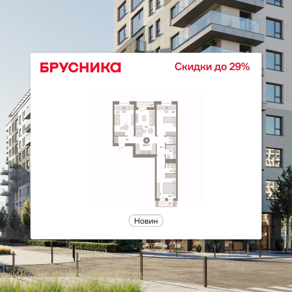 Просторная 3-комн. квартира с предчистовой отделкой в ЖК "Новин" на 3 этаже. Общая площадь: 94.61 кв.м., жилая: 48.4 кв.м., площадь просторной кухни-гостиной: 23.4 кв.м. Квартира - распашонка, без проходных комнат, окна выходят на paзные стороны дома. В квартире один балкон и одна лоджия, два совмещенных санузла. Высота потолков 2.7 м.