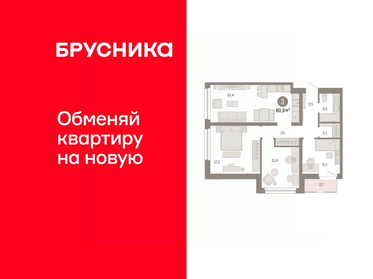 Квартира с кухней-гостиной и тремя спальнями в квартале "Нефть". Особенности планировки: предчистовая отделка, рабочий кабинет, разнесённые спальни.