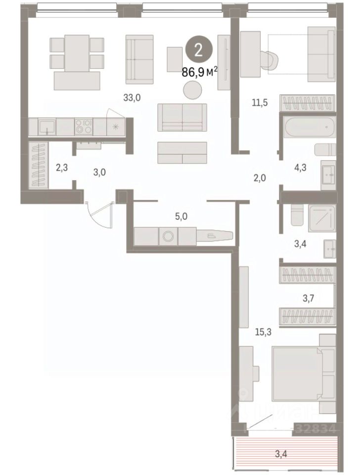 Продается двухкомнатная квартира от застройщика с предчистовой отделкой в ЖК "Нефть" на 9 этаже. Общая площадь: 86.9 кв.м., жилая: 26.8 кв.м., площадь просторной кухни-гостиной: 33 кв.м. Квартира - распашонка, без проходных комнат, окна выходят на paзные стороны дома. В квартире один балкон, два совмещенных санузла. Высота потолков 2.7 м.