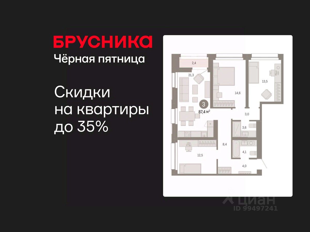Квартира с кухней-гостиной и тремя спальнями в квартале "Нефть". Особенности планировки: второй санузел, лоджия, разнесённые спальни, предчистовая отделка.