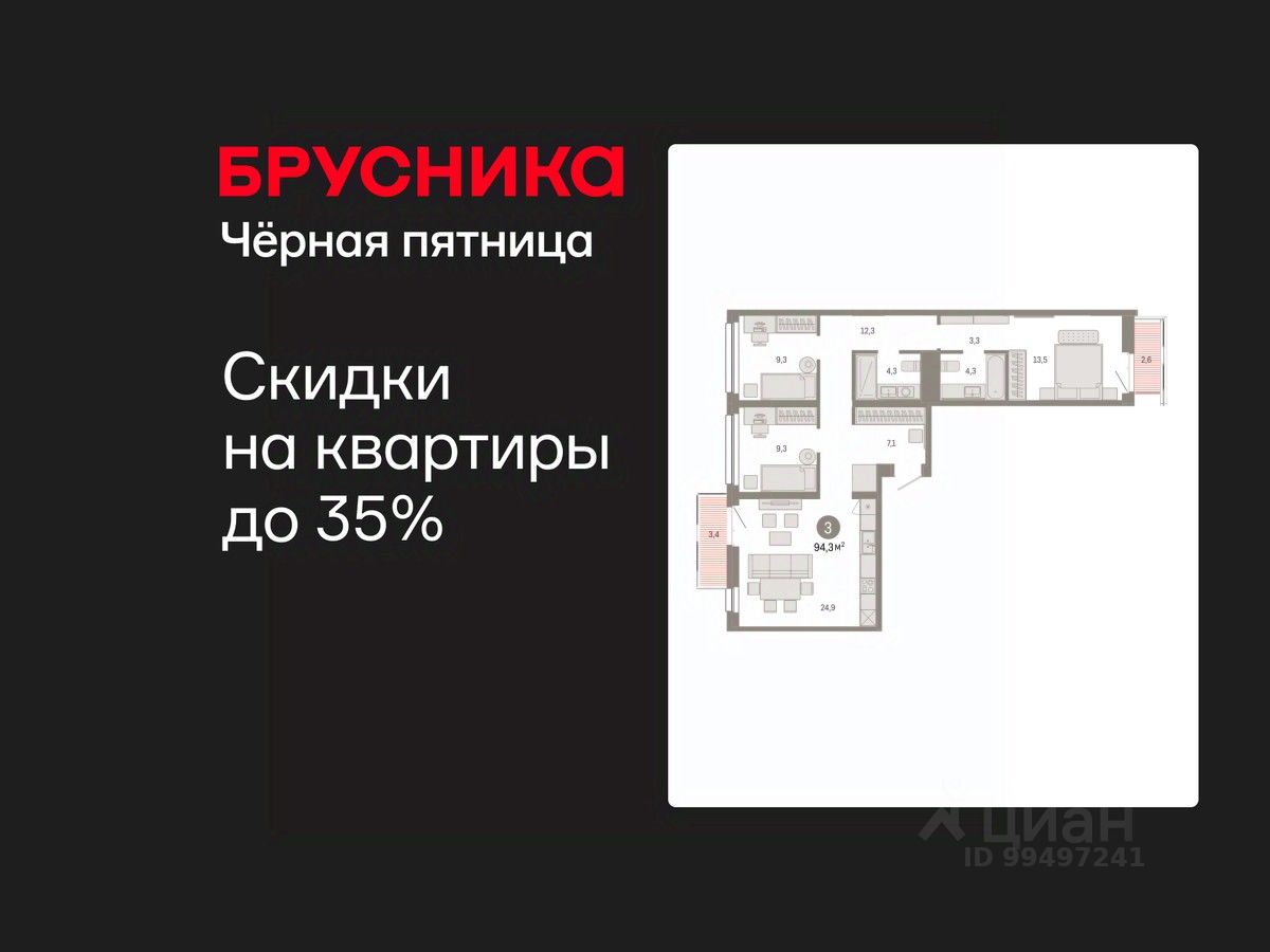 Квартира с кухней-гостиной и тремя спальнями в квартале "Нефть". Особенности планировки: вид во двор, разнесённые спальни, предчистовая отделка, мастер-спальня, балкон.