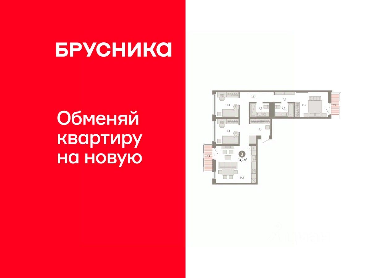 Квартира с кухней-гостиной и тремя спальнями в квартале "Нефть". Особенности планировки: балкон, предчистовая отделка, разнесённые спальни.