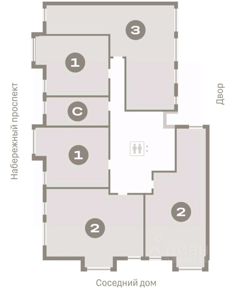 Квартира с кухней-гостиной и тремя спальнями в квартале "Нефть". Особенности планировки: вид во двор, лоджия, разнесённые спальни, предчистовая отделка, мастер-спальня, балкон.