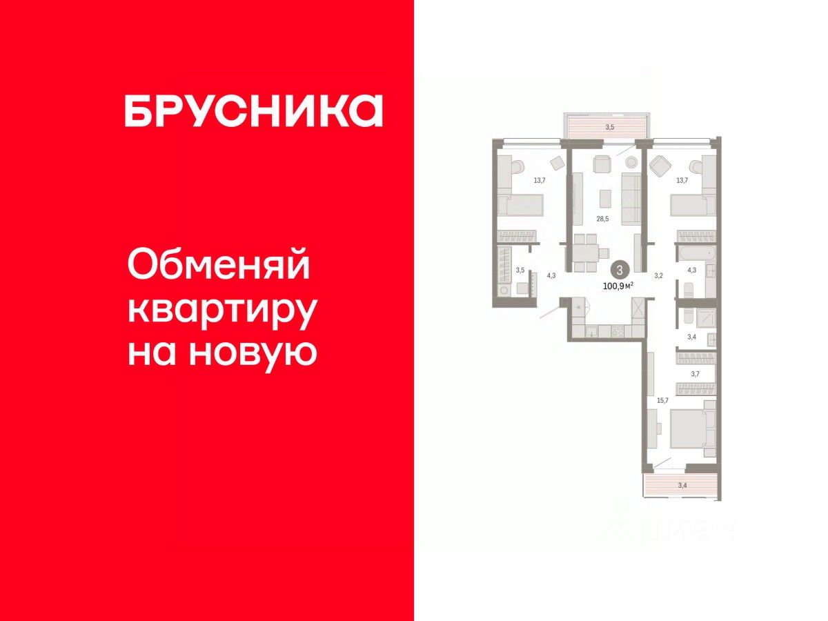 Квартира с кухней-гостиной и тремя спальнями в квартале "Нефть". Особенности планировки: балкон, предчистовая отделка, разнесённые спальни.