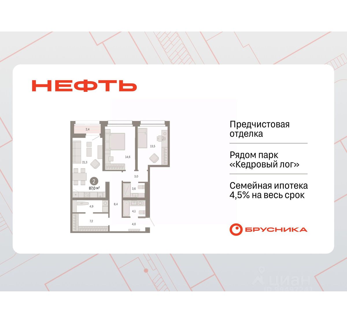 2-комн. квартира с предчистовой отделкой в ЖК "Нефть" на 5 этаже. Общая площадь: 87 кв.м., жилая: 28.1 кв.м., площадь просторной кухни-гостиной: 21.3 кв.м. Комнаты изолированные, все окна выходят на одну сторону. В квартире одна лоджия, два совмещенных санузла. Высота потолков 2.7 м.
