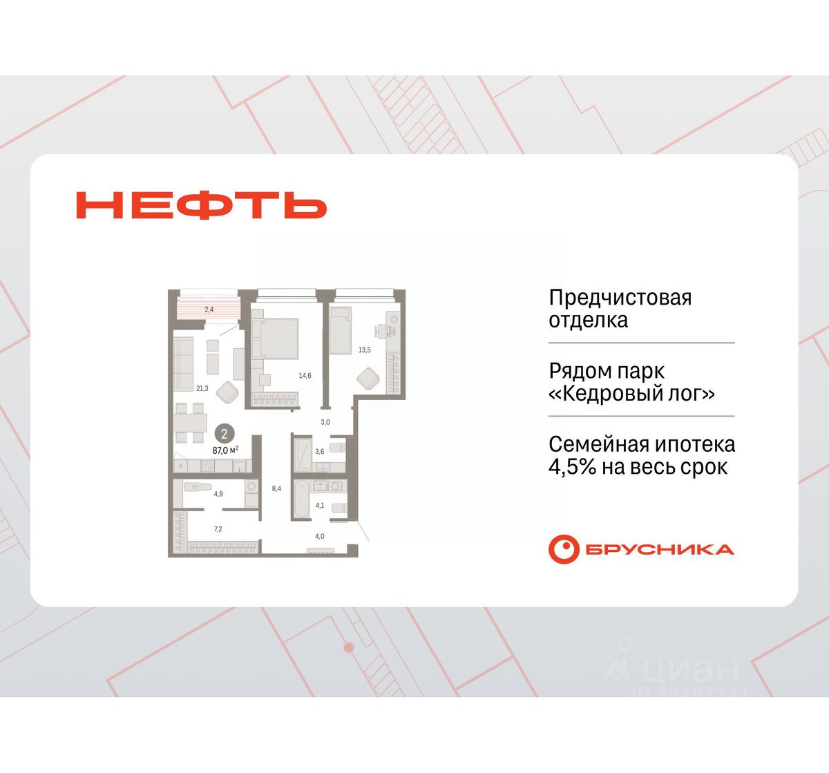 Двухкомнатная квартира с предчистовой отделкой в ЖК "Нефть" на 11 этаже. Общая площадь: 87 кв.м., жилая: 28.1 кв.м., площадь просторной кухни-гостиной: 21.3 кв.м. Комнаты изолированные, все окна выходят на одну сторону. В квартире одна лоджия, два совмещенных санузла. Высота потолков 2.7 м.