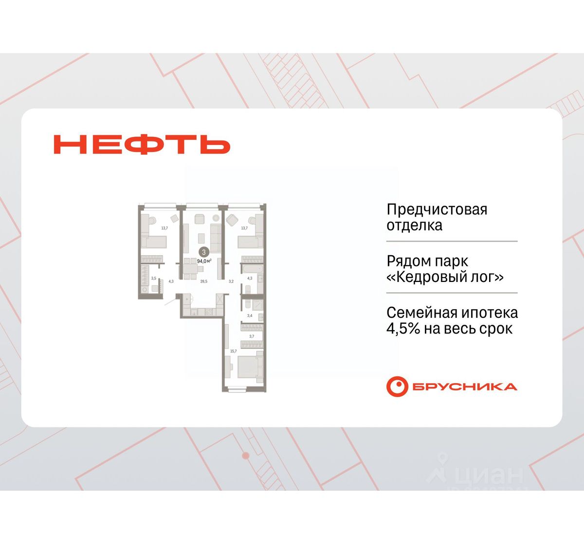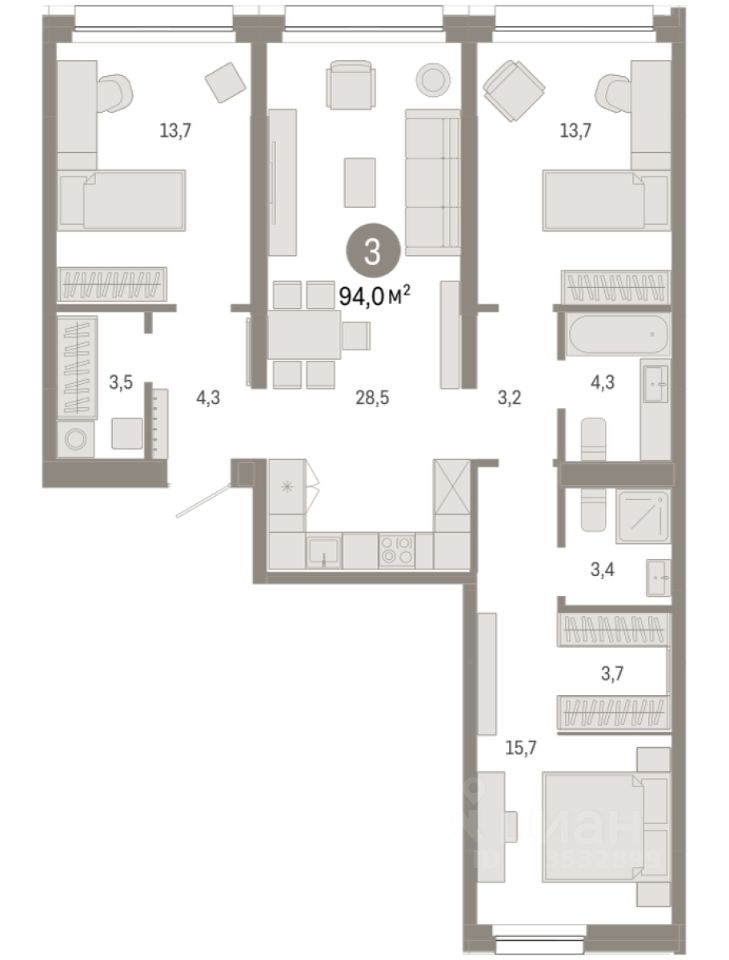 Квартира с кухней-гостиной и тремя спальнями в квартале "Нефть". Особенности планировки: гардеробная, вид во двор, разнесённые спальни, предчистовая отделка, мастер-спальня, постирочная.
