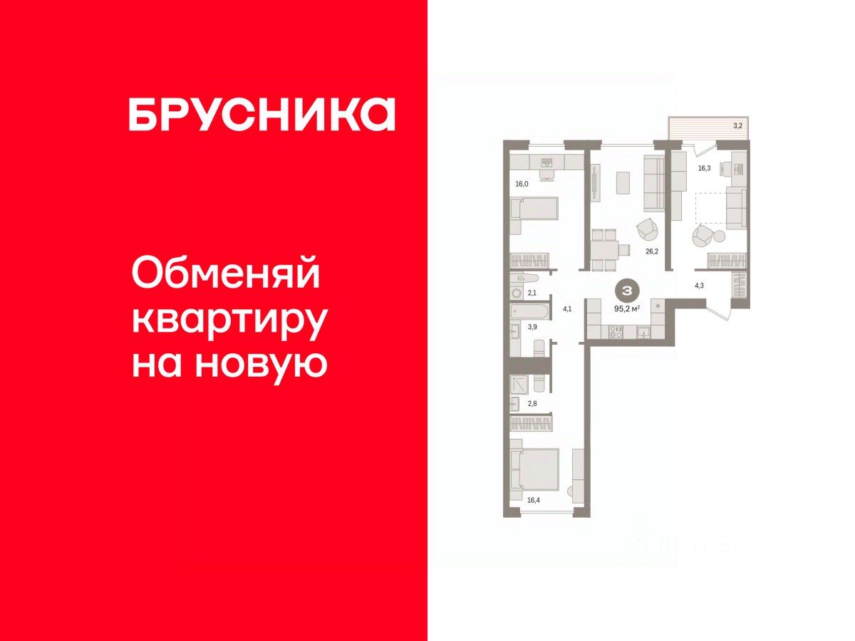 Квартира с кухней-гостиной и тремя спальнями в квартале "Новин". Особенности планировки: балкон, окна на две стороны, предчистовая отделка, разнесённые спальни.