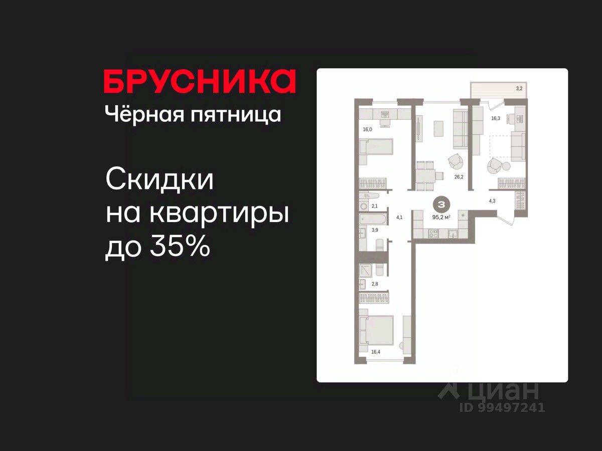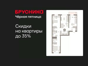 Квартира с кухней-гостиной и тремя спальнями в квартале "Новин". Особенности планировки: окна на две стороны, вид во двор, разнесённые спальни, предчистовая отделка, мастер-спальня, постирочная, балкон.