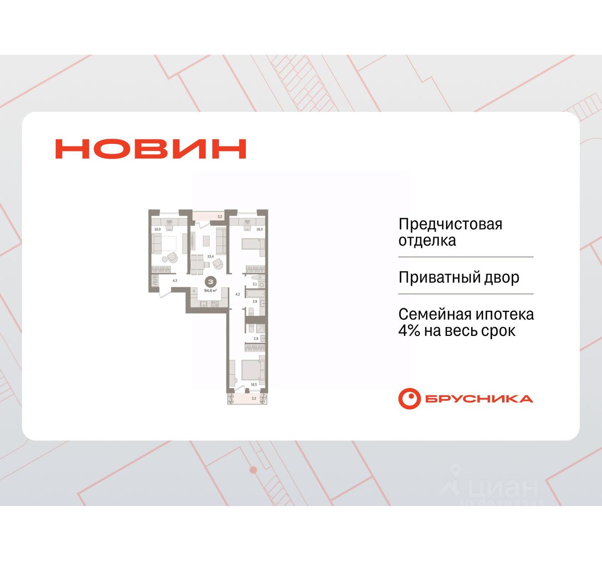 Квартира с кухней-гостиной и тремя спальнями в квартале "Новин". Особенности планировки: окна на две стороны, вид во двор, лоджия, разнесённые спальни, предчистовая отделка, мастер-спальня, постирочная, балкон.