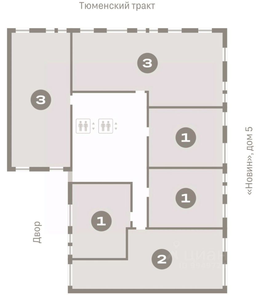 Квартира с кухней-гостиной и двумя спальнями в квартале "Новин". Особенности планировки: окна на две стороны, вид во двор, разнесённые спальни, предчистовая отделка, мастер-спальня.