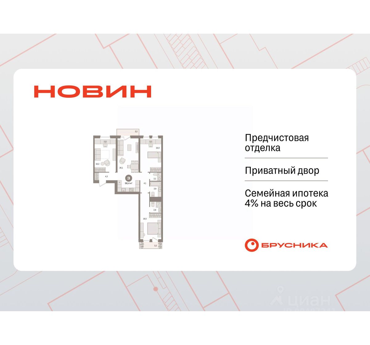 3-комн. квартира с предчистовой отделкой в ЖК "Новин" на 6 этаже. Общая площадь: 98.4 кв.м. Высота потолков 2.7 м.