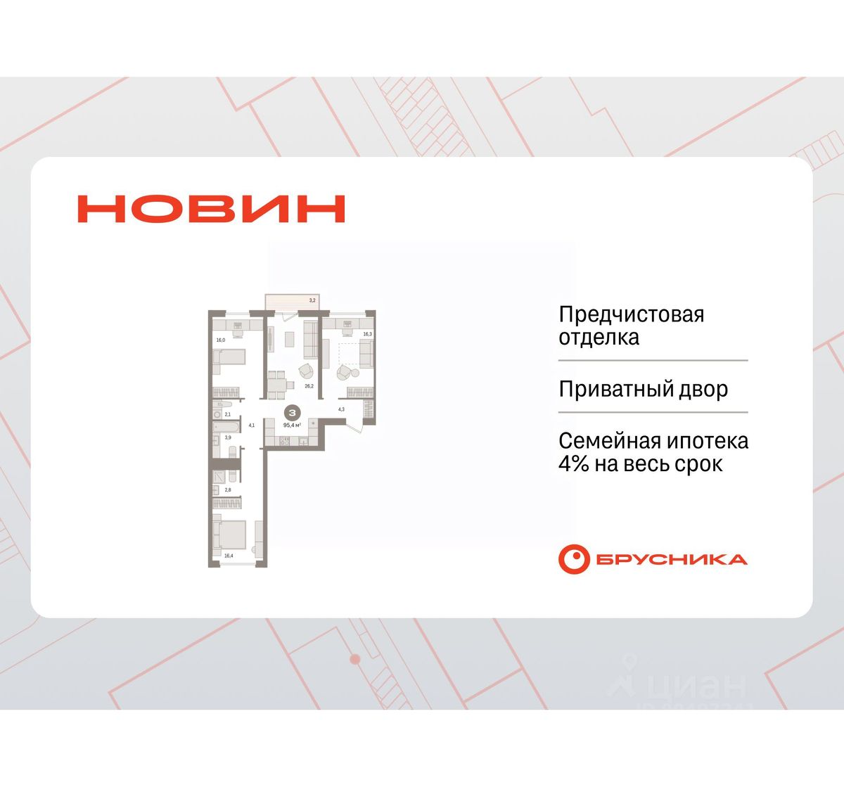 Квартира с кухней-гостиной и тремя спальнями в квартале "Новин". Особенности планировки: окна на две стороны, вид во двор, разнесённые спальни, предчистовая отделка, мастер-спальня, постирочная, балкон.